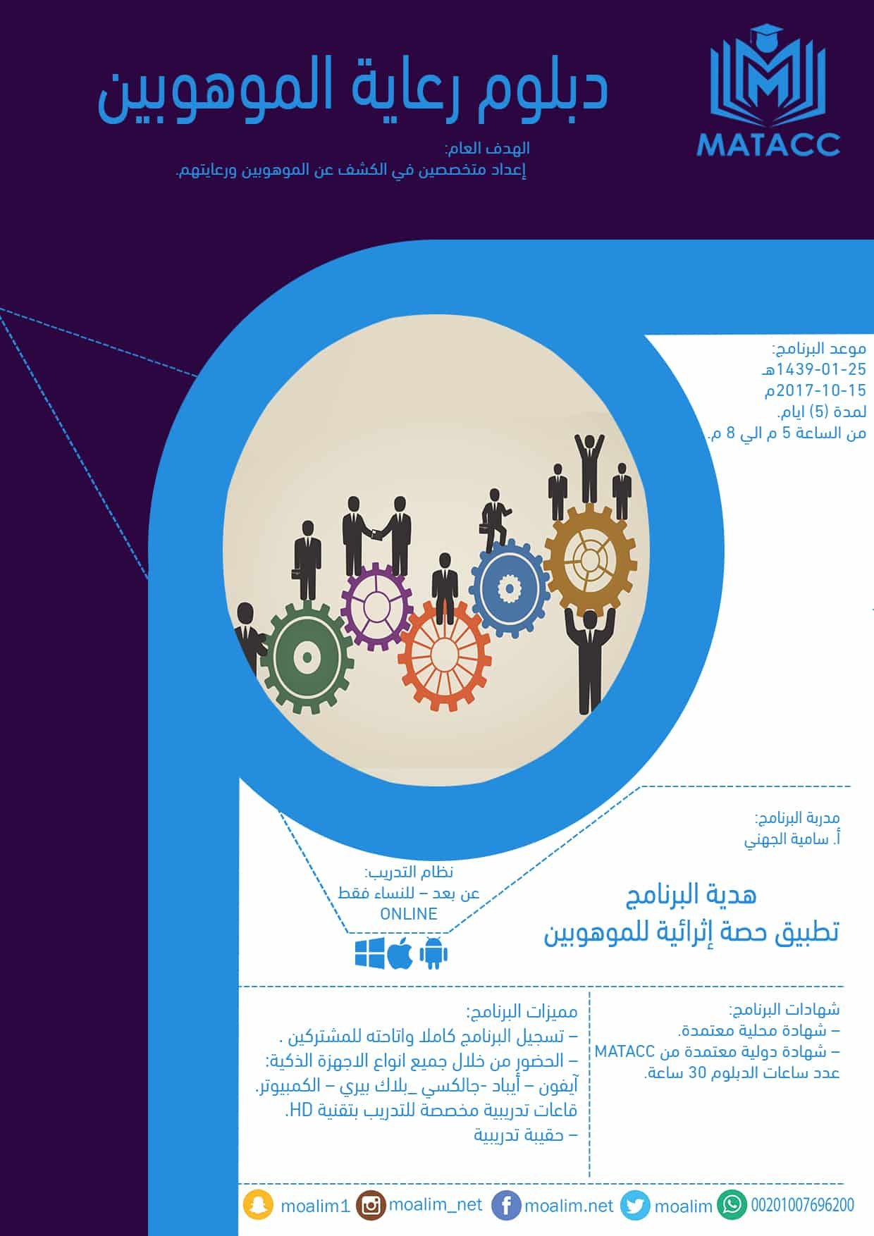 [ujicountdown id=”new” expire=”2017/10/15 14:00″ hide=”false” url=”” rectype=”second” repeats=””] الهدف العام : إعداد متخصصين في الكشف عن الموهوبين ورعايتهم.الأهداف التفصيلية : يتوقع في نهاية البرنامج أن يكون المتدرب قادراً على : – تطبيق أساليب الكشف عن الموهوبين. – إيجاد بيئة تربوية تتيح للموهوبين إبراز قدراتهم وتنمية إمكاناتهم ومواهبهم. – رعاية تربوية منظمة للموهوب من خلال برامج رعاية الموهوبين المعتمدة عالمياً. – فهم الاحتياجات النفسية للموهوب والتعامل معها. – يصمم برامج رعاية الموهوبين.المستهدفون : المعملون والمعلمات في المدراس . اعضاء هيئة التدريس في الجامعات . مدراء المدارس . كل من طبيعة عمله مرتبطه بالتربية. كل من يرغب بتطوير نفسه.محاور الدبلوم: ١- الخلفيه التاريخية للموهبه وتطورها ٢-خصائص الموهوبين وسماتهم ٣-برامج الموهوبين ٤-استراتيجيات تدريس الموهوبين ٥-توجيه وإرشاد الموهوبينالخلفيه التاريخية للموهبه وتطورها (الاسلام والموهبة – مفهوم تطور الموهبة – الموهوب – مصطلحات متداولة بين أفراد المجتمع ) طرق واساليب التعرف على الموهوبين (أهداف التعرف والكشف على الموهوبين – كيف يتم اكتشاف الموهوبين – اساليب الكشف – الاعتقادات والأخطاء في عمليه الكشف عن الموهوبين ) خصائص الموهوبين (الخصائص السلوكيه – الخصائص الجسميه – الخصائص العقلية – الخصائص الغير معرفية – ابرز خصائص الموهوبين في العصر الحديث ) برامج الموهوبين ( أهداف البرامج – الفرضيات التي تقوم عليها برامج الموهوبين – اساليب برامج الموهوبين) استراتيجيات تدريس الموهوبين ( العصف الذهني – التلمذة – الدراسه المستقلة – طرح الاسئله – الاستراتيجاات الحديثة) التوجيه وإرشاد الموهوبين ( أهداف التوجيه والارشاد – مجالات ارشاد الموهوبين – الحاجات النفسيه – مشكلات الارشاد – المشكلات التي تواجه الموهوبين في المدارس وطرق التغلب عليها)مدربة البرنامج: أ. سامية الجهني تفوق عقلي وموهبة – جامعة الملك عبدالعزيز معلمة موهوبات مدربة معتمدة في تصميم البرامج الاثرائية مدربة معتمدة في الاخلاقيات العلمية مدربة معتمدة STEM مدربة معتمدة لفصول الموهوبينهدية البرنامج:تطبيق حصة إثرائية للموهوبين موعد البرنامج: 1439-01-25هـ 2017-10-15م لمدة (5) ايام.من الساعة 5 م الي 8 مساء.نظام التدريب: عن بعد – للنساء فقط.شهادات البرنامج: – شهادة محلية معتمدة. – شهادة دولية معتمدة من MATACCمميزات البرنامج: – تسجيل البرنامج كاملا واتاحته للمشتركين . – الحضور من خلال جميع انواع الاجهزة الذكية: آيفون – أيباد -جالكسي _بلاك بيري – الكمبيوتر. قاعات تدريبية مخصصة للتدريب بتقنية HD. – حقيبة تدريبيةقيمة البرنامج: – سعر البرنامج الاساسي 2200 ريال. – التسجيل المبكر بـ 1100ريال.للتسجيل :تم قفل التسجيلشكرا لمن سجل معنا