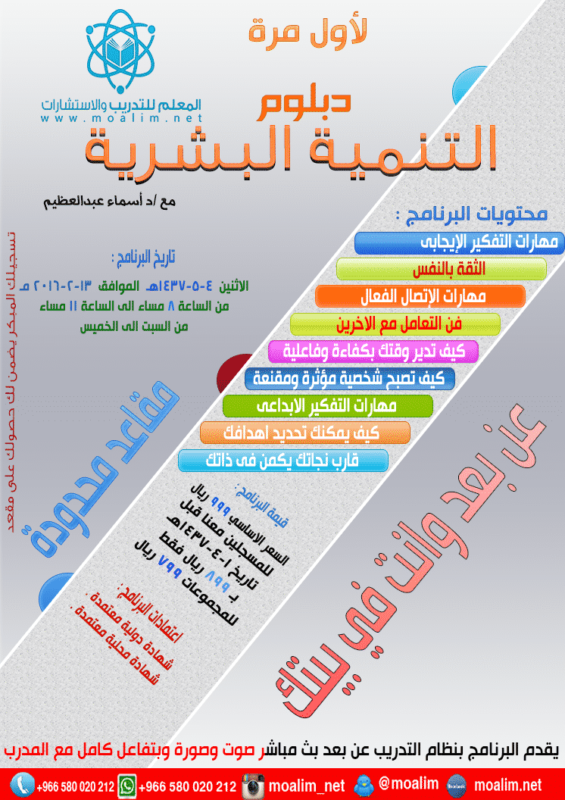 مرحبا بك شكرا لزيارتك هذه الصفحة نبارك لك اعتماد اسمك في دورة الذكاء العاطفي والانماط الاجتماعية موعد الدورة يوم الاربعاء الموافق 27/12/1437هـ حسب تقويم ام القرى من الساعة 8.45 مساء ونأمل منك اتباع الخطوات التالية لحضور الدورة ثم اصدار شهادتكم التدريبية اولا تسجيل عضوية في موقعنا باتباع الخطوات التالية: زيارة الرابط التالي : http://www.moalim.com.sa/s/login/signup.php وعبي