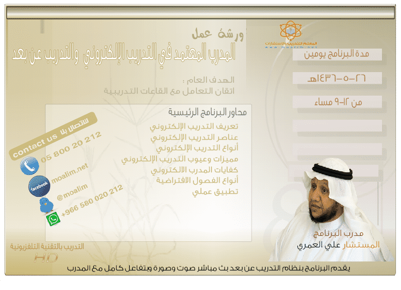 باقي على بداية البرنامج : [countdown date=2015/3/17-20:00:00] [timer] [/countdown] المدرب المعتمد في التدريب الالكتروني والتدريب عن بعد الفئة المستهدفة: للمدربين والمدربات للنساء والرجال تدريب عن بعد مباشر عبر قاعات افتراضية خاصة بتقنية HD ذات الجودة العالية وبتفاعل كامل مع المدرب محاور البرنامج تعريف التدريب الإلكتروني عناصر التدريب الإلكتروني أنواع التدريب الإلكتروني مميزات وعيوب التدريب الإلكتروني