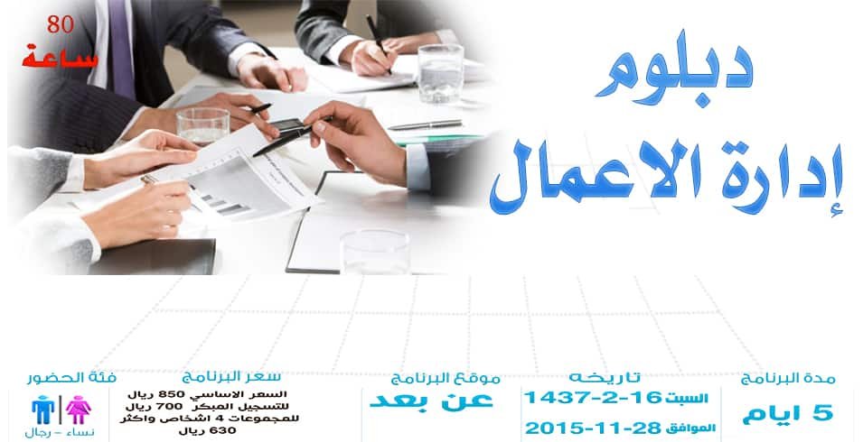 باقي على بداية البرنامج : [countdown date=2015/11/28-19:45:00][timer][/countdown] دبلوم إدارة الاعمال للنساء والرجال تدريب عن بعد مباشر عبر قاعات افتراضية خاصة بتقنية HD ذات الجودة العالية وبتفاعل كامل مع المدرب محاور البرنامج : المحور الأول: إدارة الأعمال وقيادتها • مفهوم إدارة الأعمال وأهميتها • ممارسة وظيفة التخطيط الإداري •