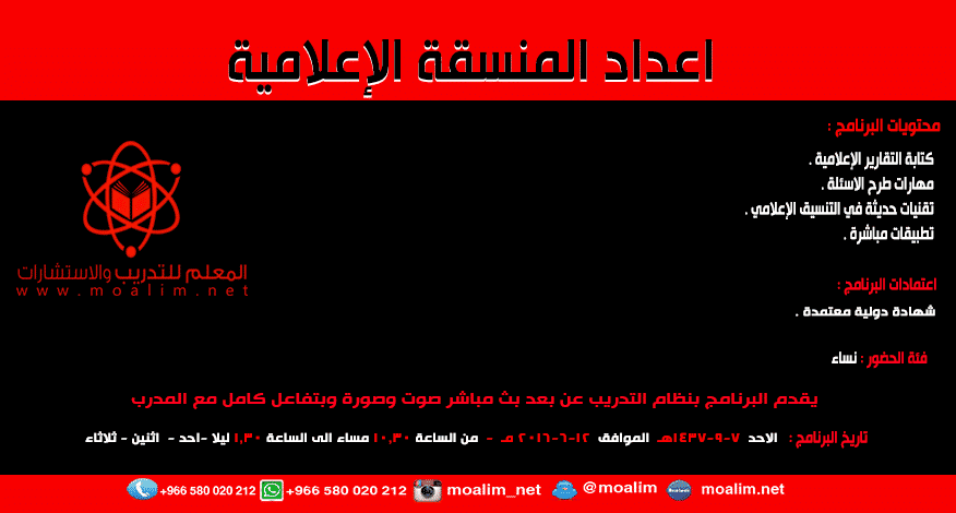 باقي على بداية البرنامج : [countdown date=2015/2/22-20:00:00][timer][/countdown] البرنامج التدريبي رقم (28) لإعداد المدرب المحترف الفئة المستهدفة: للمدربين والمدربات لكل من يريد أن تكون له بصمة لكل من لدية القدرة على أن يكون من المبدعين لكن من يريد أن يصبح مدرب محترف لكل من يرغب أن يطور نفسة ويصبح ذو شأن للنساء والرجال تدريب عن بعد